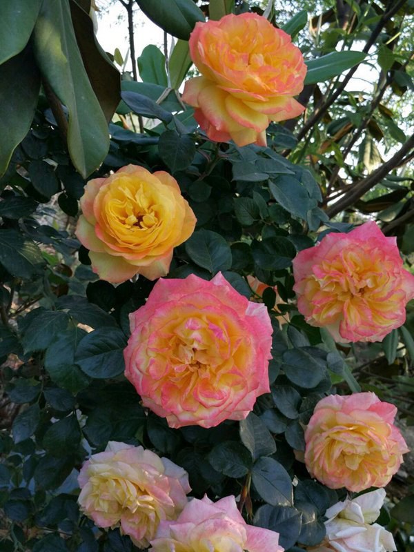 藤彩虹四季開花,晚春至初夏數量最多。花開初期是金黃色,到了中期變成金黃鑲紅邊,到了后期還會變顏色,變成桃紅色,藤彩虹花型是高中心,褶邊開花形式重瓣,它四季開花,花期較長,單枝可同期開花20朵左右,它的葉子的顏色是綠色,最初嫩葉的顏色是紅色,這是一個非常勤花的品種,而且每一朵花從開花到凋謝都會顯示出不同的花型和顏色,非常獨特。它的枝條上刺很少,枝條細而有韌性,分枝特別多,可用于做植物造形,花藍編制,